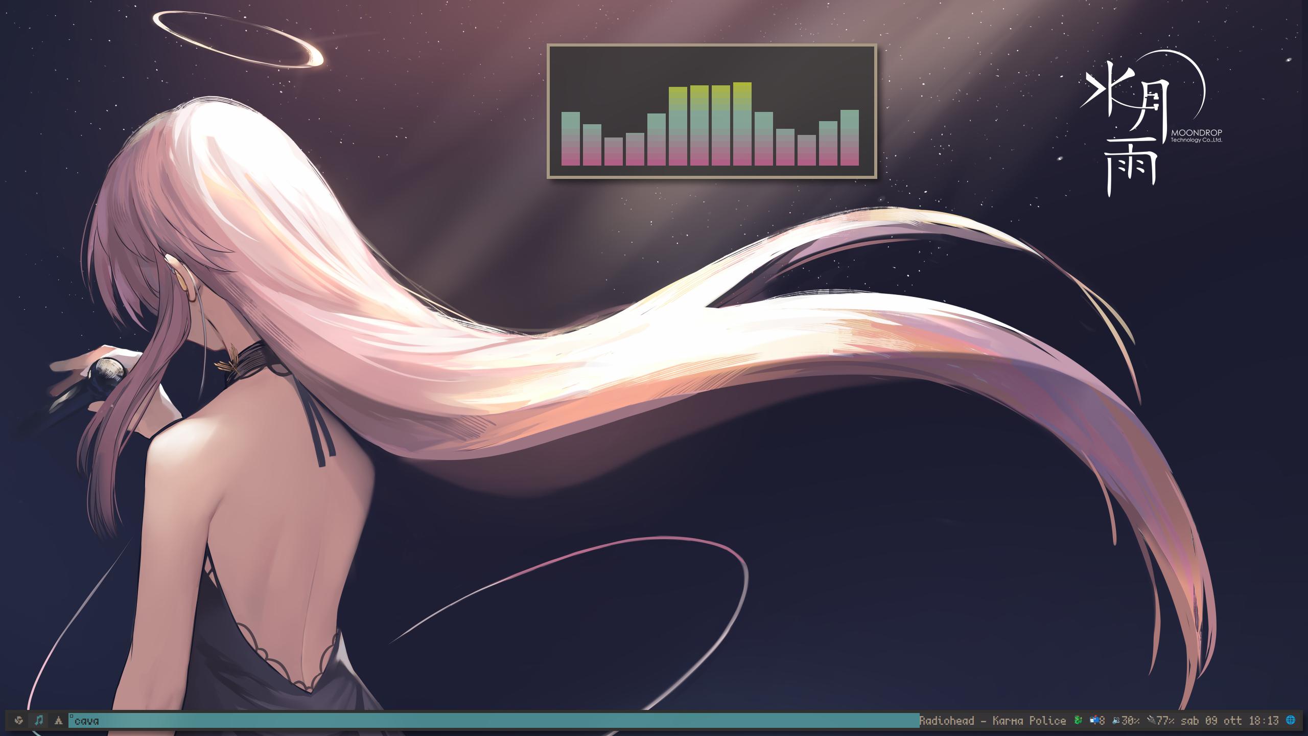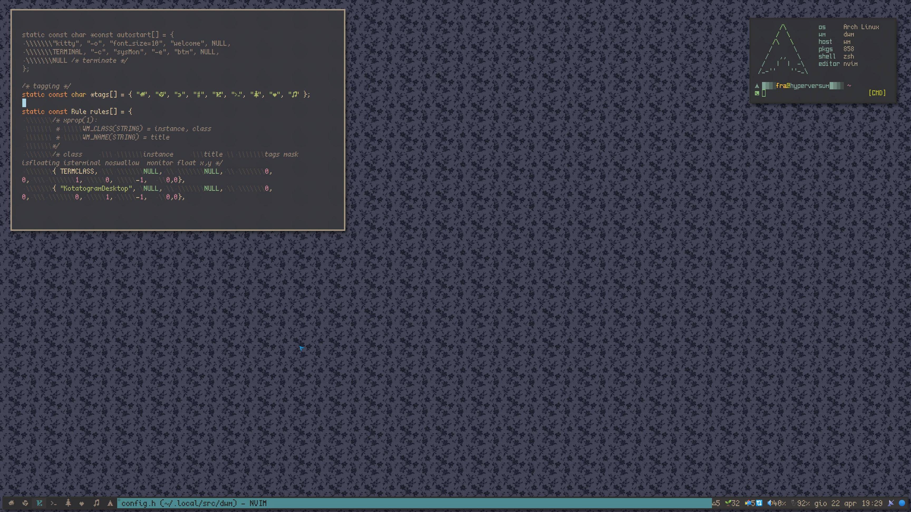 - Suckless utilities (links are to my patched repositories): dmenu, dwm (Window Manager), st (terminal emulator) and xss+slock (screensaver).