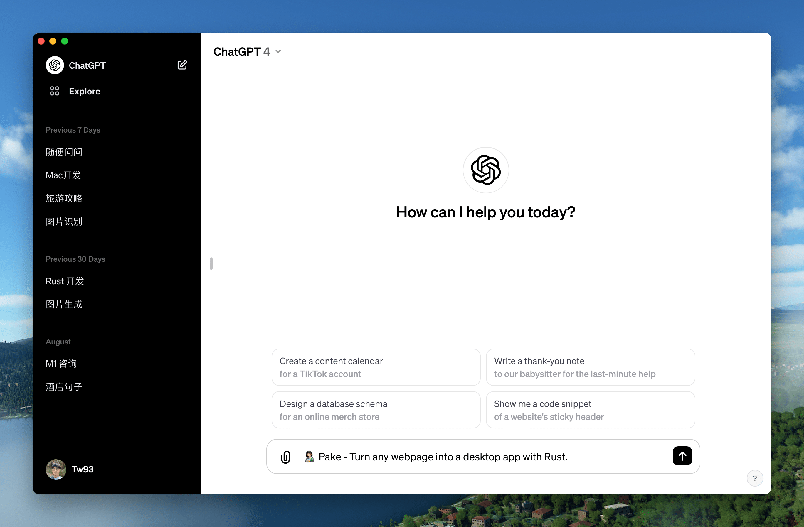 pake https://weekly.tw93.fun --name Weekly --icon https://cdn.tw93.fun/pake/weekly.icns --width 1200 --height 800 --hide-title-barFirst-time packaging requires environment setup and may be slower, subsequent builds are fast. For complete parameter documentation, see CLI Usage Guide. Don't want to use CLI? Try GitHub Actions Online Building.